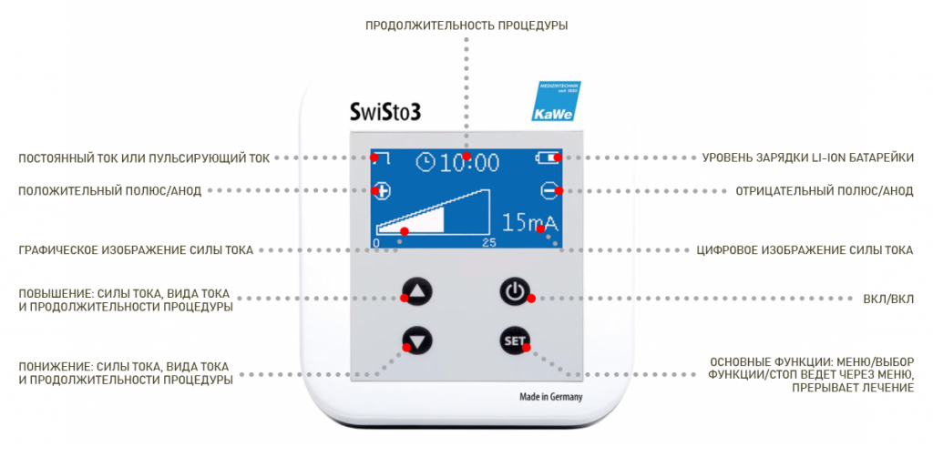 | Основные функции: меню/выбор функции/стоп ведет через меню, прерывает лечение |